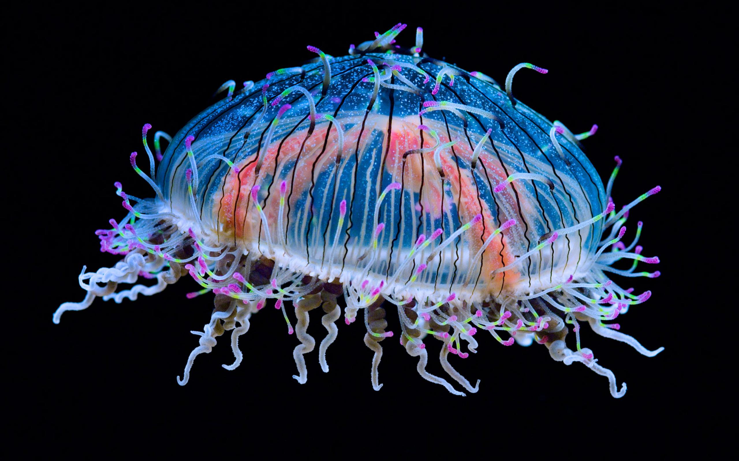 Обои Красивая разноцветная медуза на черном фоне