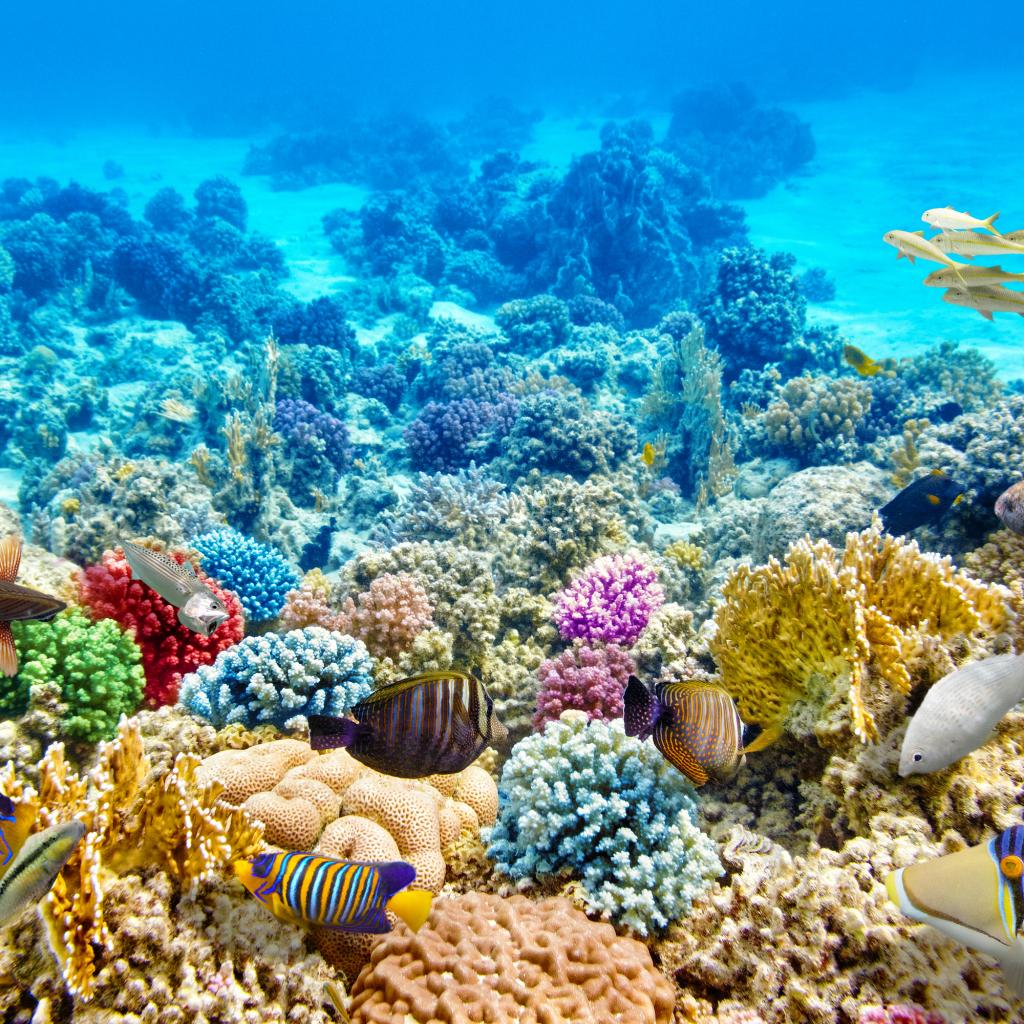 Обои Разноцветные морские рыбы и кораллы под водой