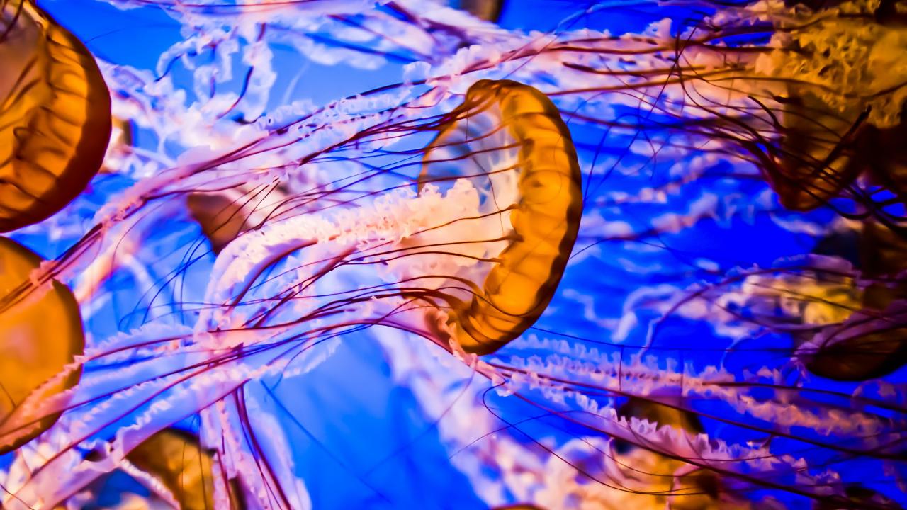 Обои Разноцветные медузы под водой крупным планом