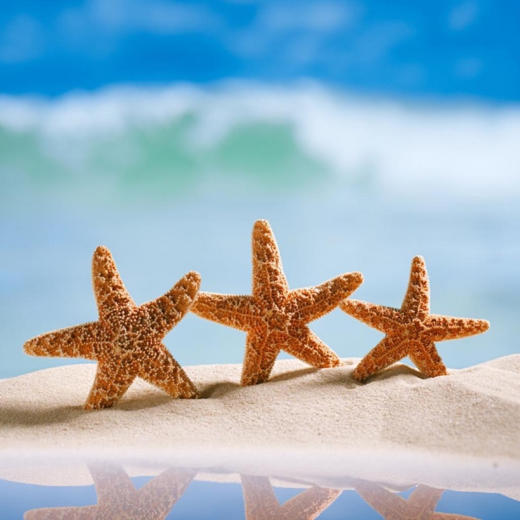 Обои Три оранжевых морских звезды на желтом песке на море