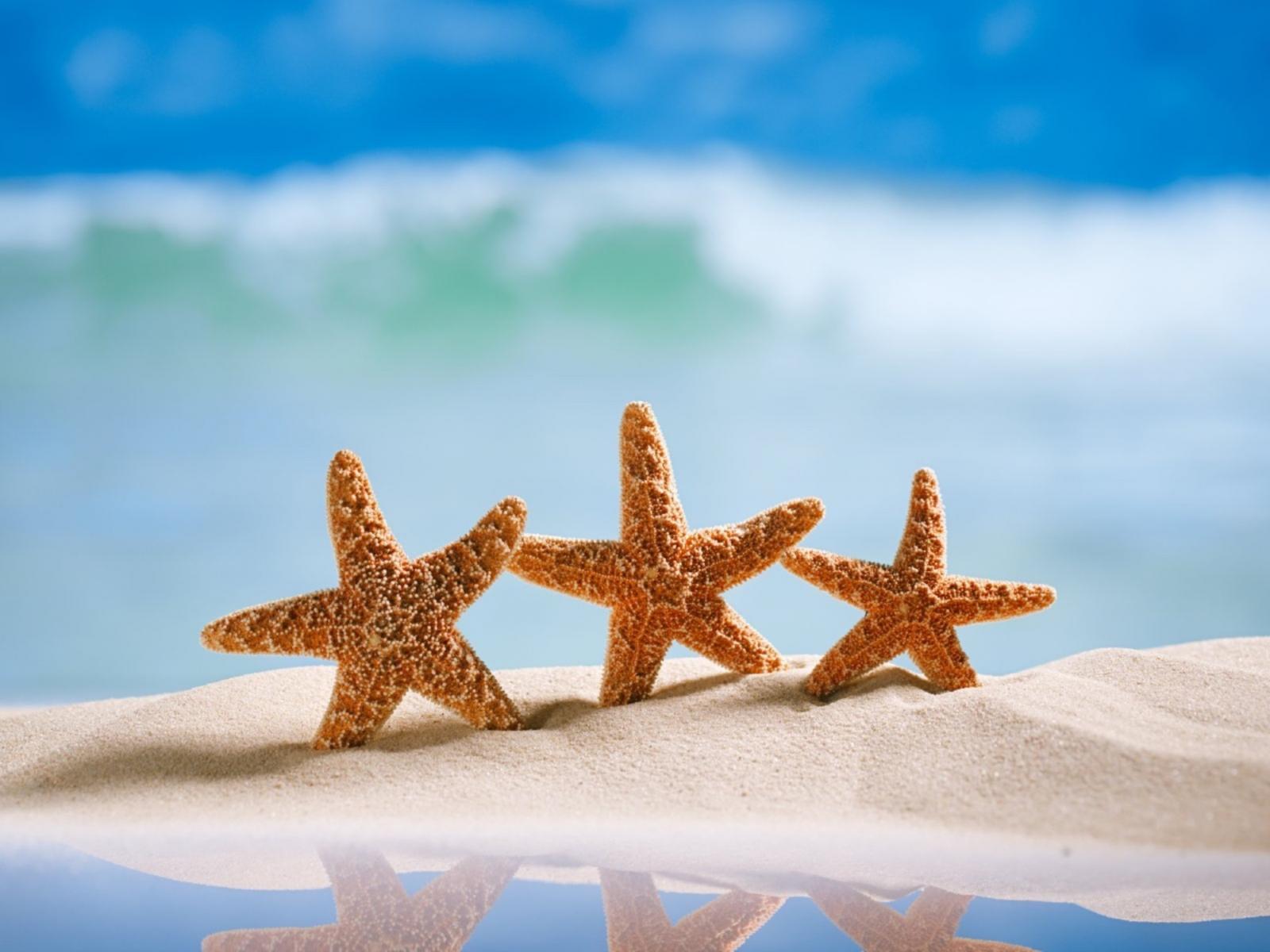 Обои Три оранжевых морских звезды на желтом песке на море