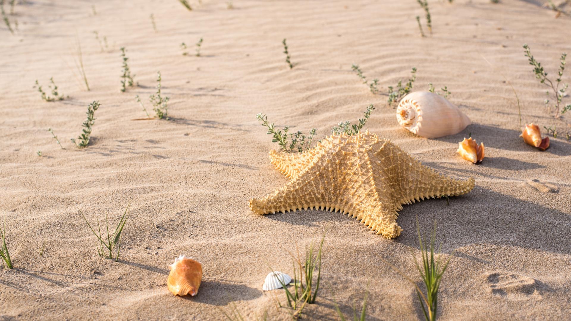 Обои Морская звезда и ракушки на песке в лучах солнца