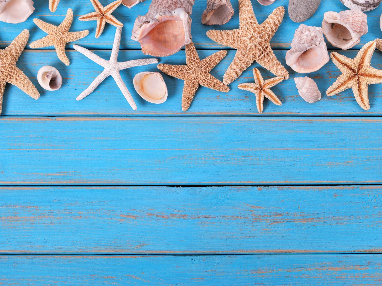 Обои Ракушки и морские звезды на голубом деревянном фоне