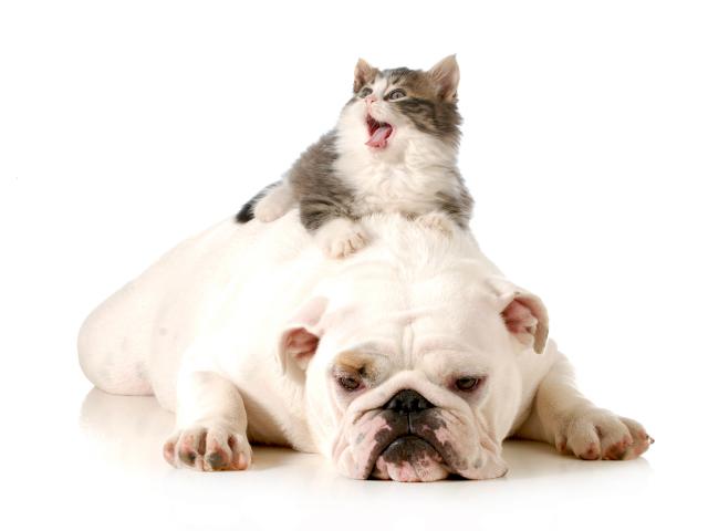 Обои Маленький котенок лежит на грустном английском бульдоге