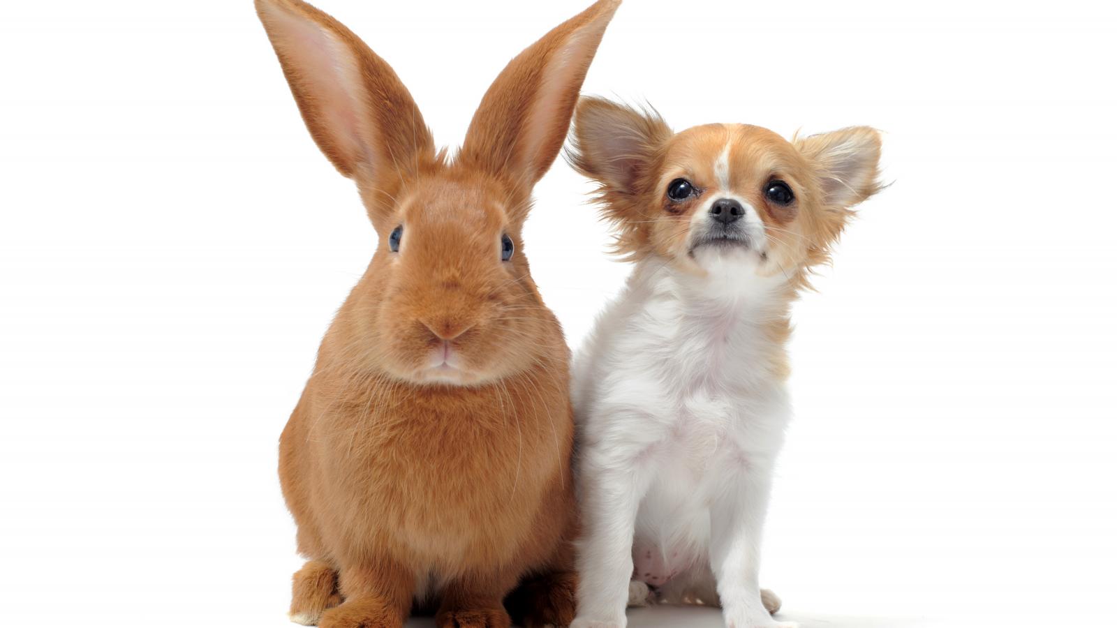 Обои Большой рыжий кролик и чихуахуа на белом фоне
