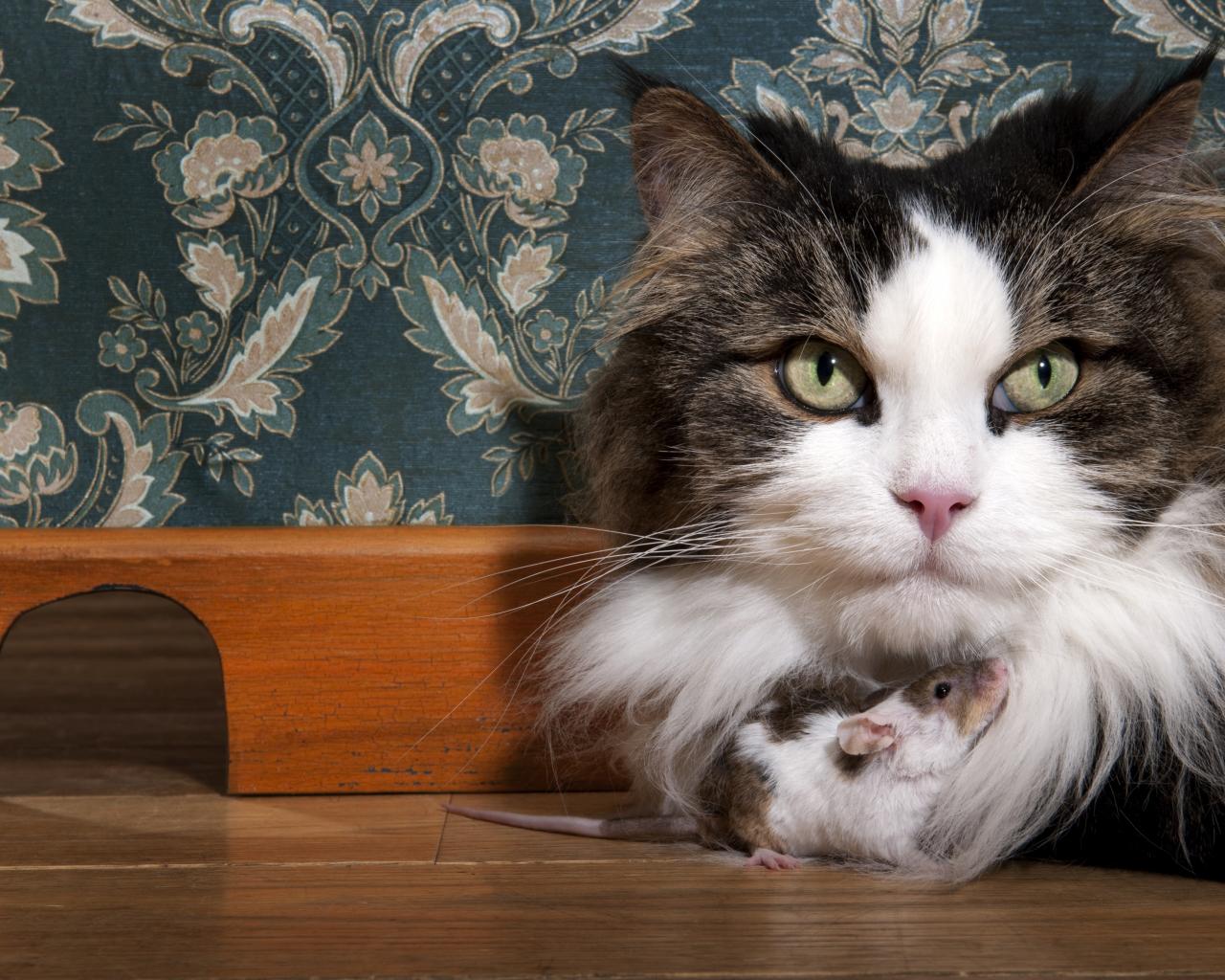 Обои Большая пушистая кошка с мышонком