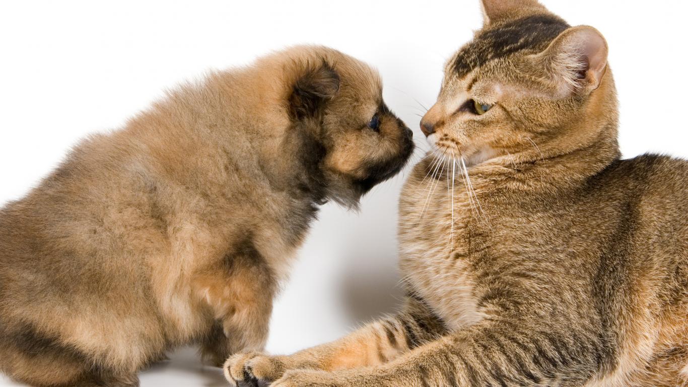 Обои Большой кот со щенком на белом фоне