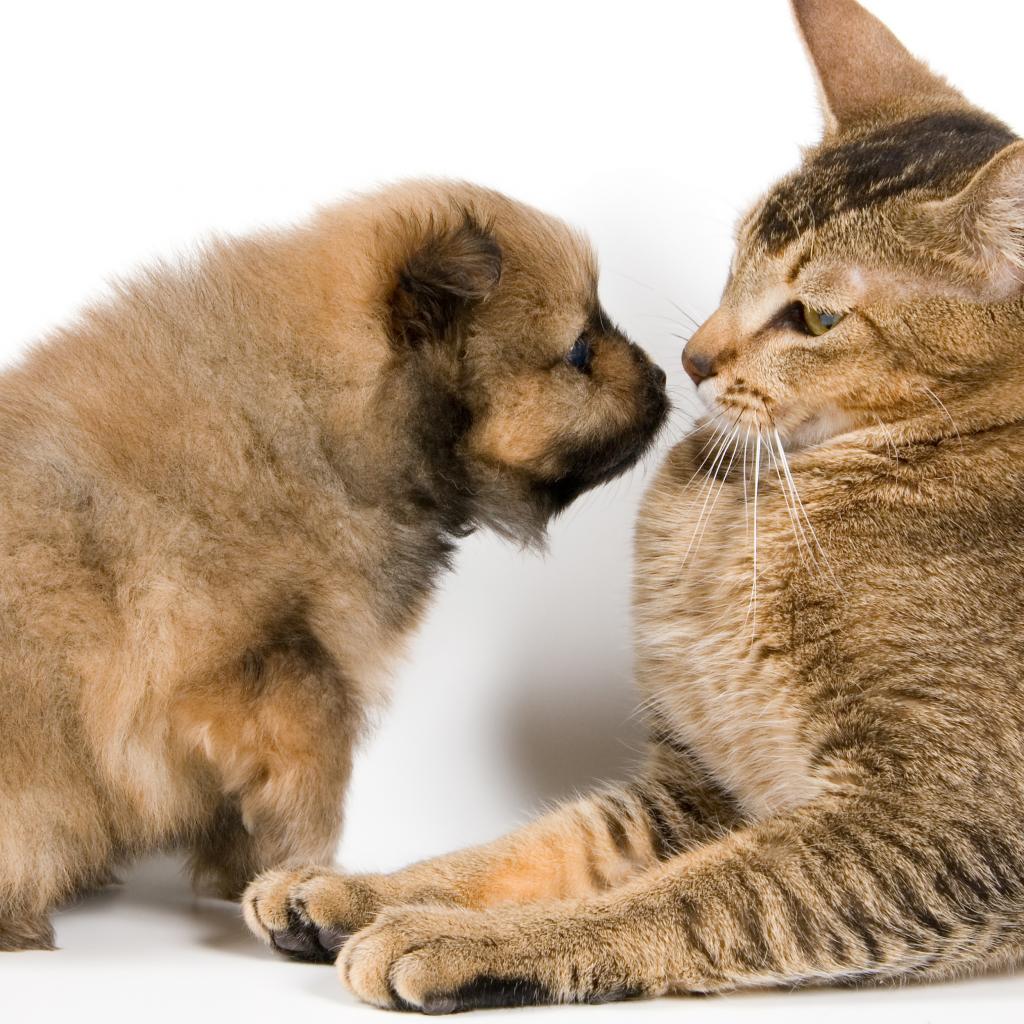 Обои Большой кот со щенком на белом фоне