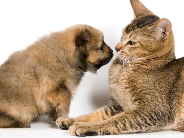 Обои Большой кот со щенком на белом фоне