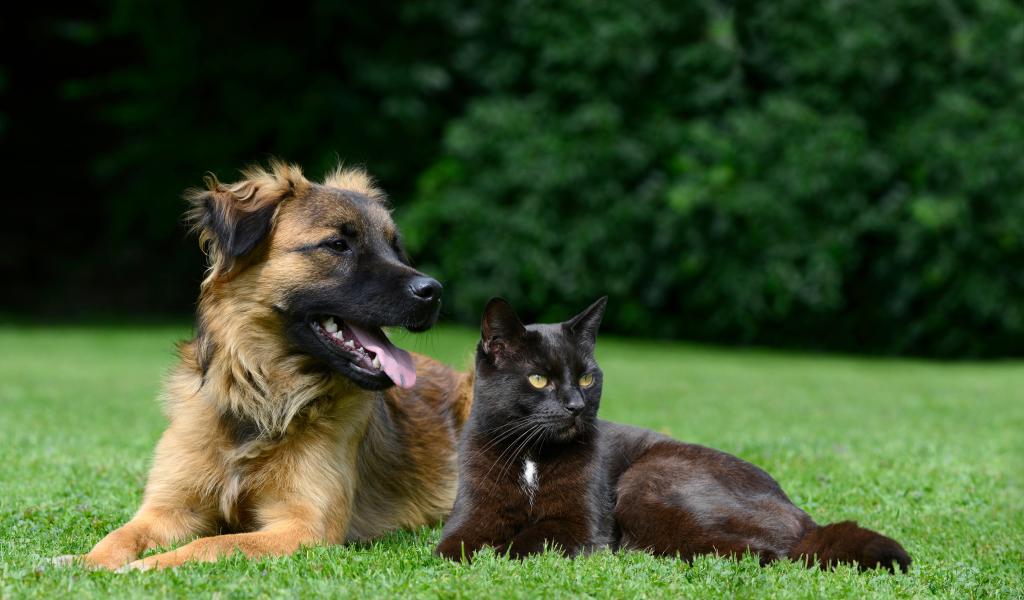 Обои Черный кот и собака лежат на зеленой траве