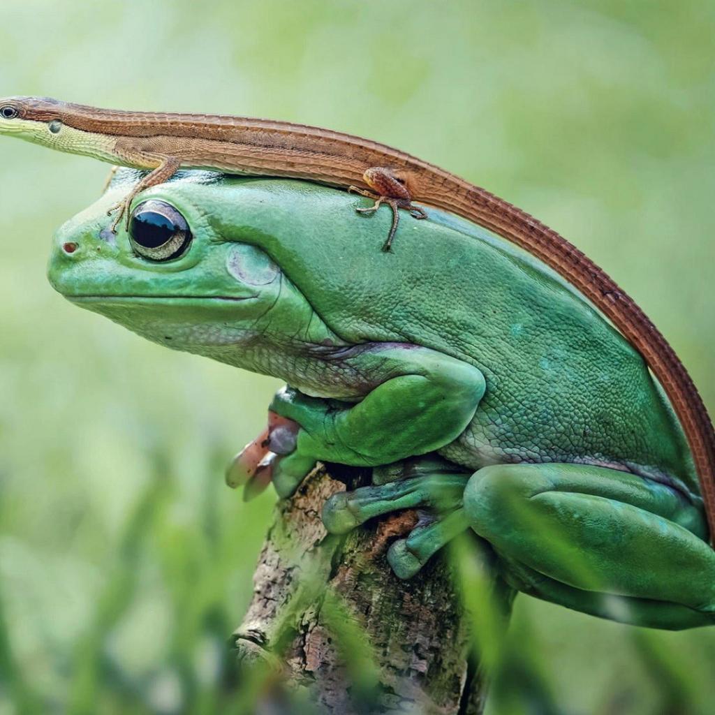 Обои Ящерица сидит на зеленой лягушке