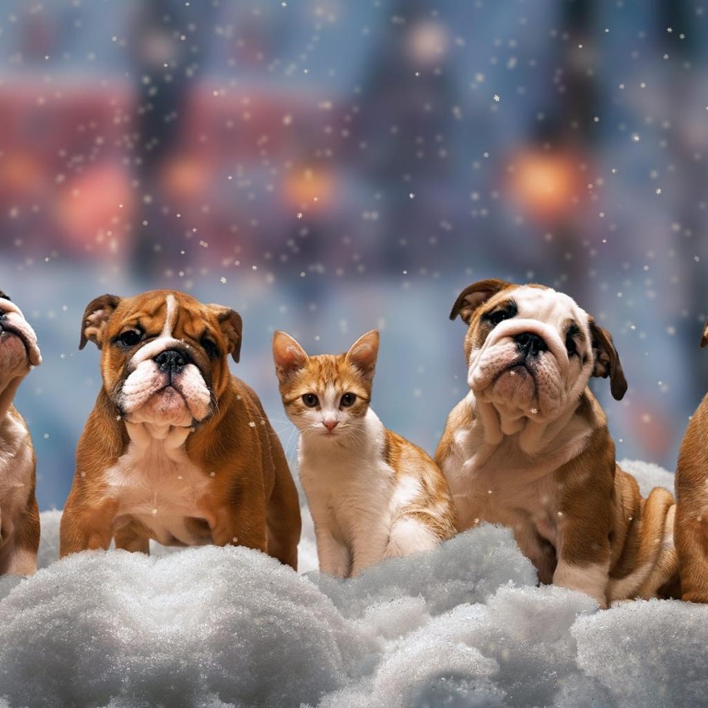 Обои Четыре щенка бульдога и котенок на снегу