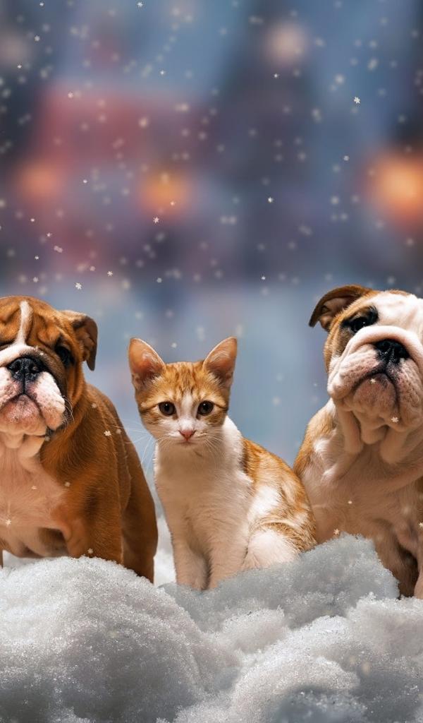 Обои Четыре щенка бульдога и котенок на снегу