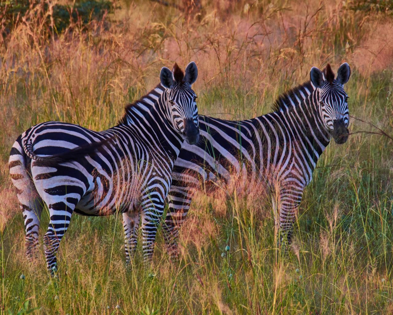 Обои Две полосатые зебры в траве