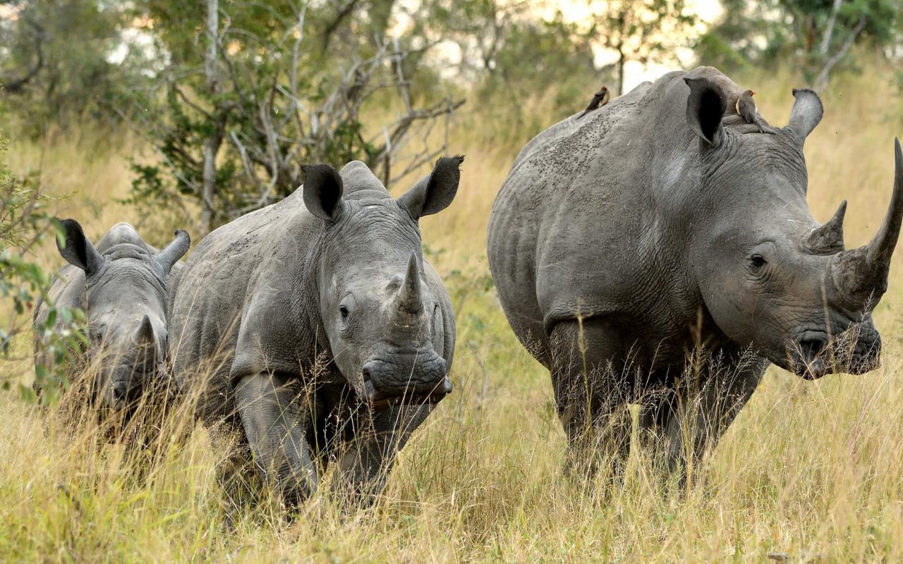 Обои Семья носорогов идет по траве