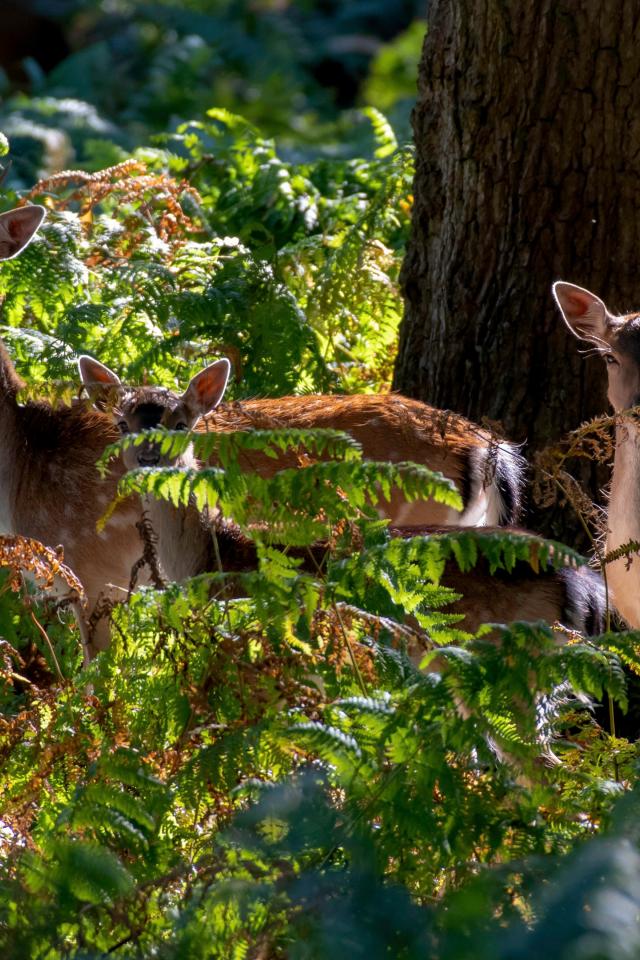 Обои Стадо оленей у дерева в зарослях