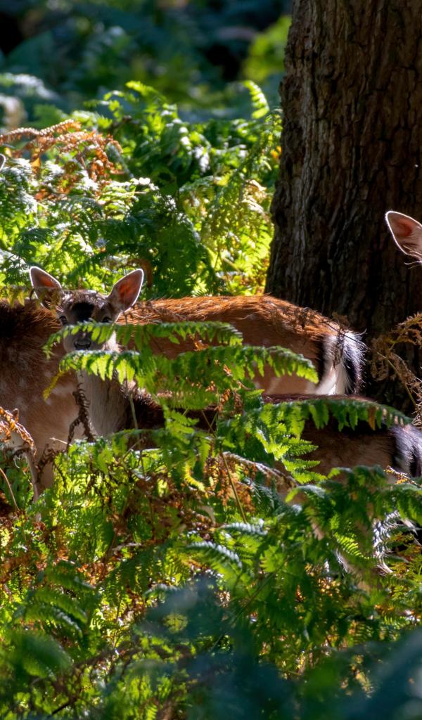 Обои Стадо оленей у дерева в зарослях