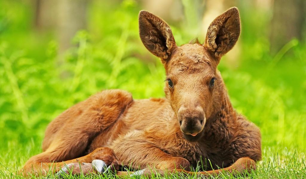 Обои Маленький лосенок лежит на зеленой траве