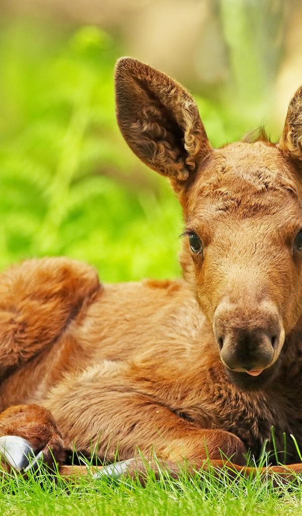 Обои Маленький лосенок лежит на зеленой траве