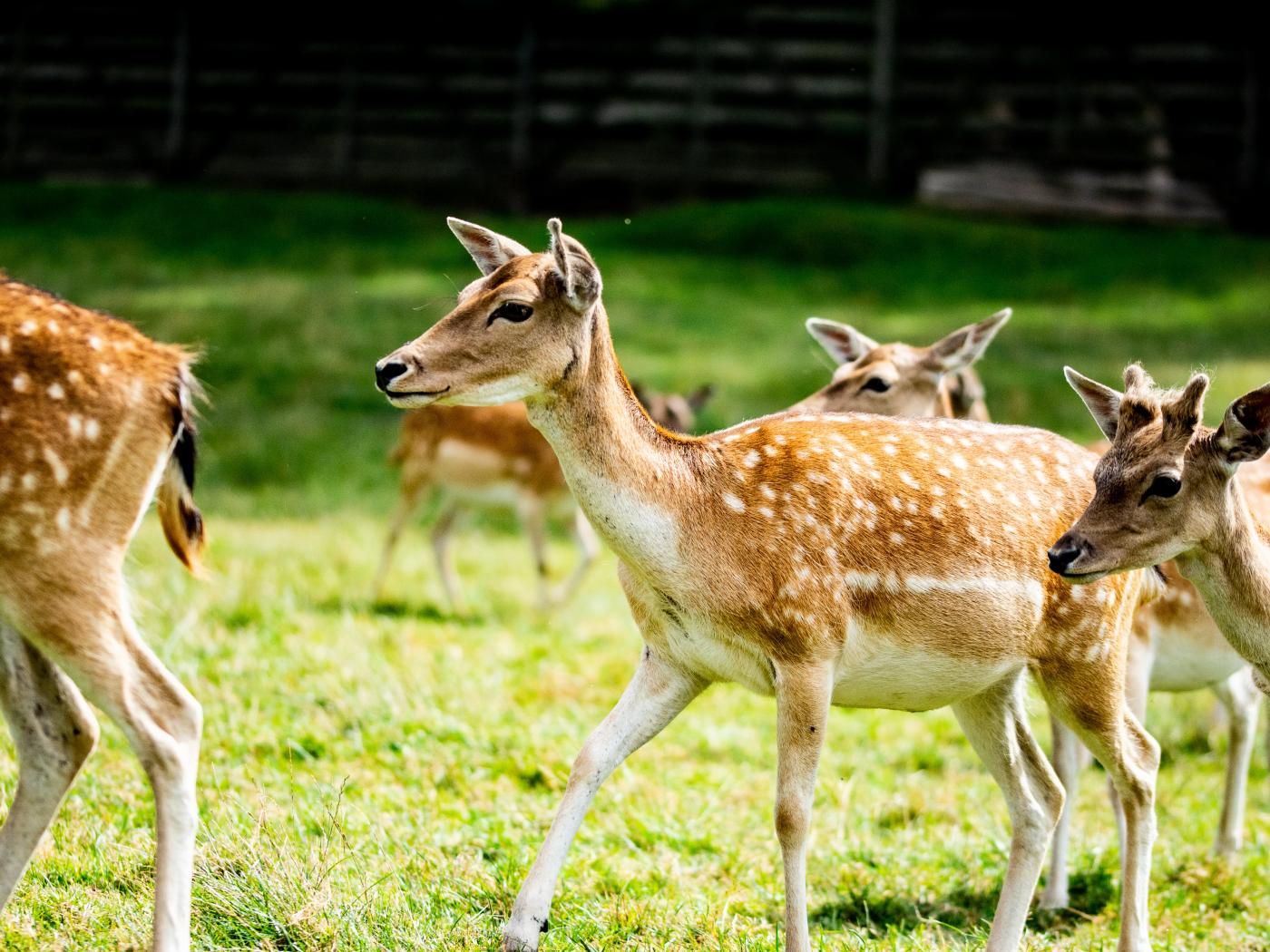 Обои Олени пасутся в загоне на зеленой траве