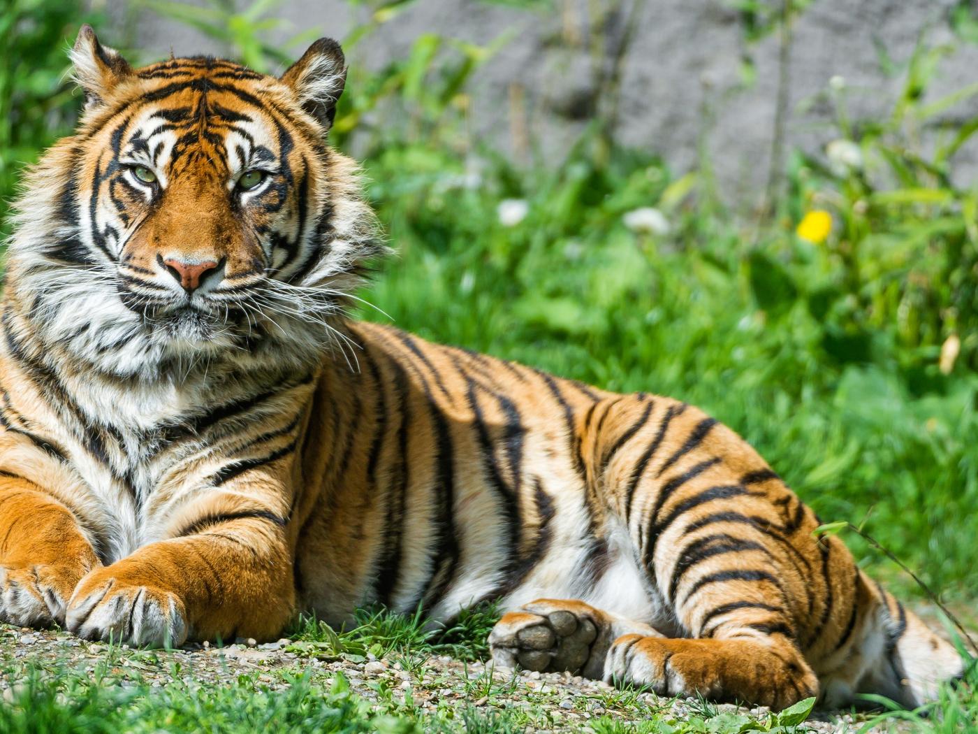 Обои Благородный тигр лежит на зеленой траве