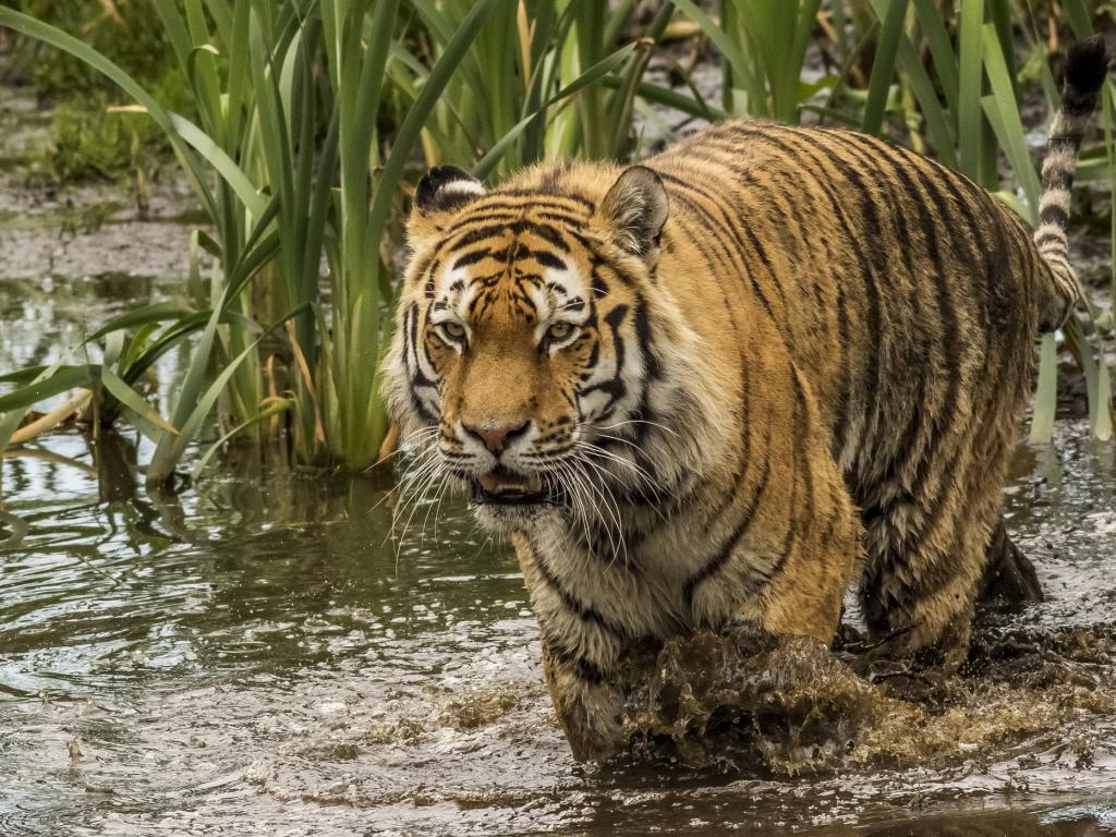 Обои Большой тигр идет по грязной воде