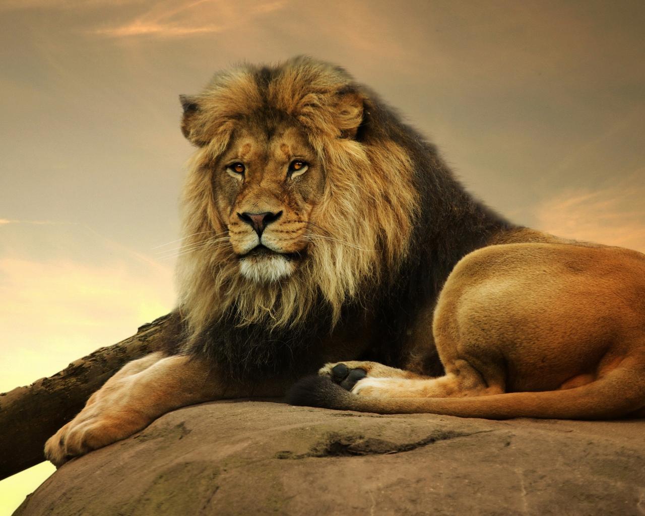 Обои Большой лев лежит на камне на закате