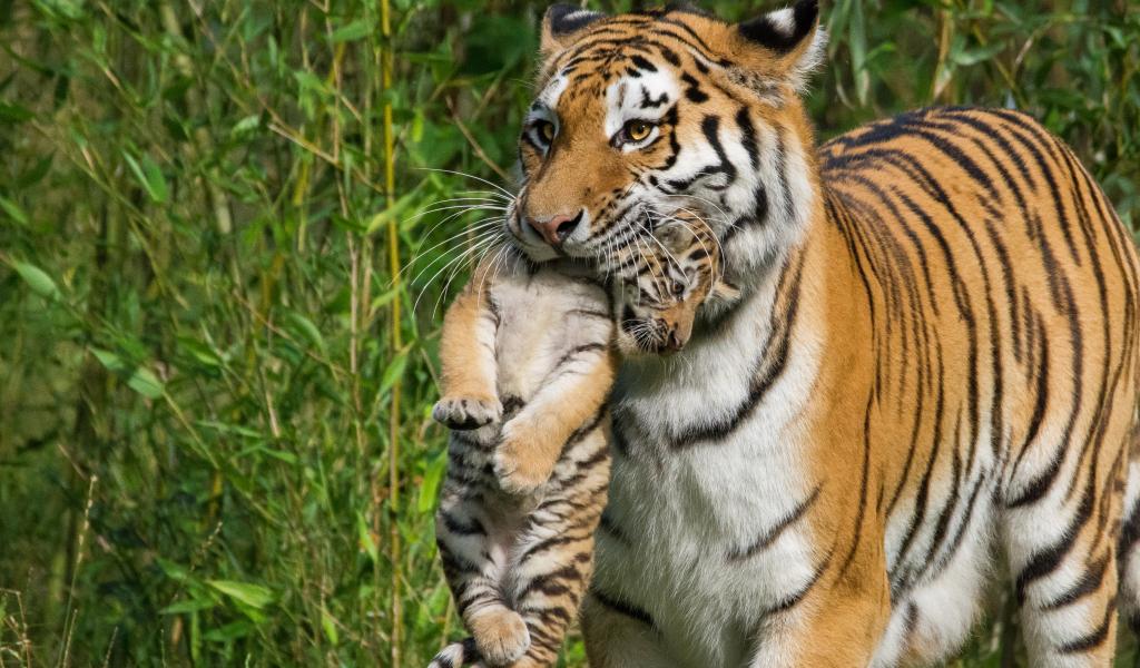 Обои Мама тигрица несет детеныша в зубах