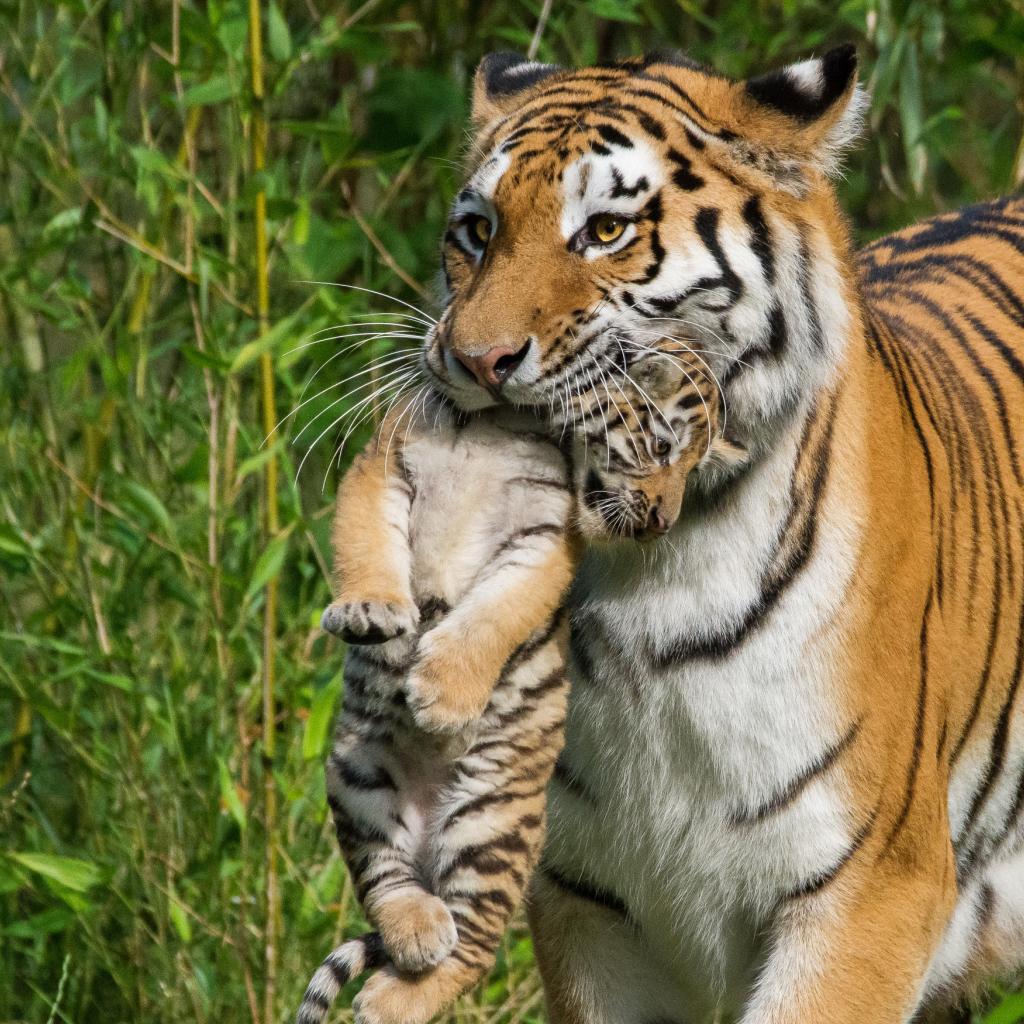 Обои Мама тигрица несет детеныша в зубах