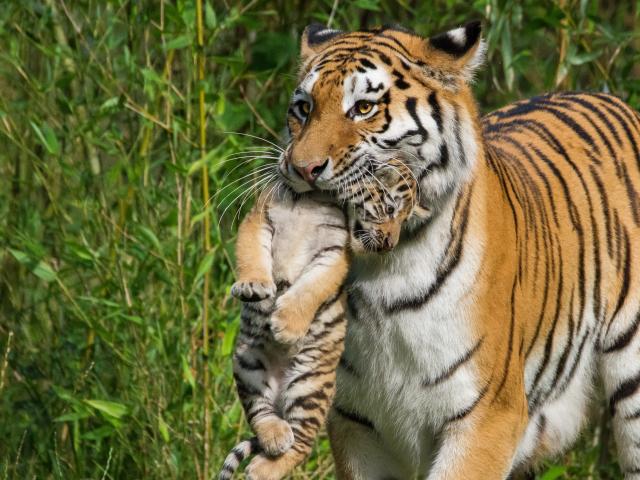 Обои Мама тигрица несет детеныша в зубах