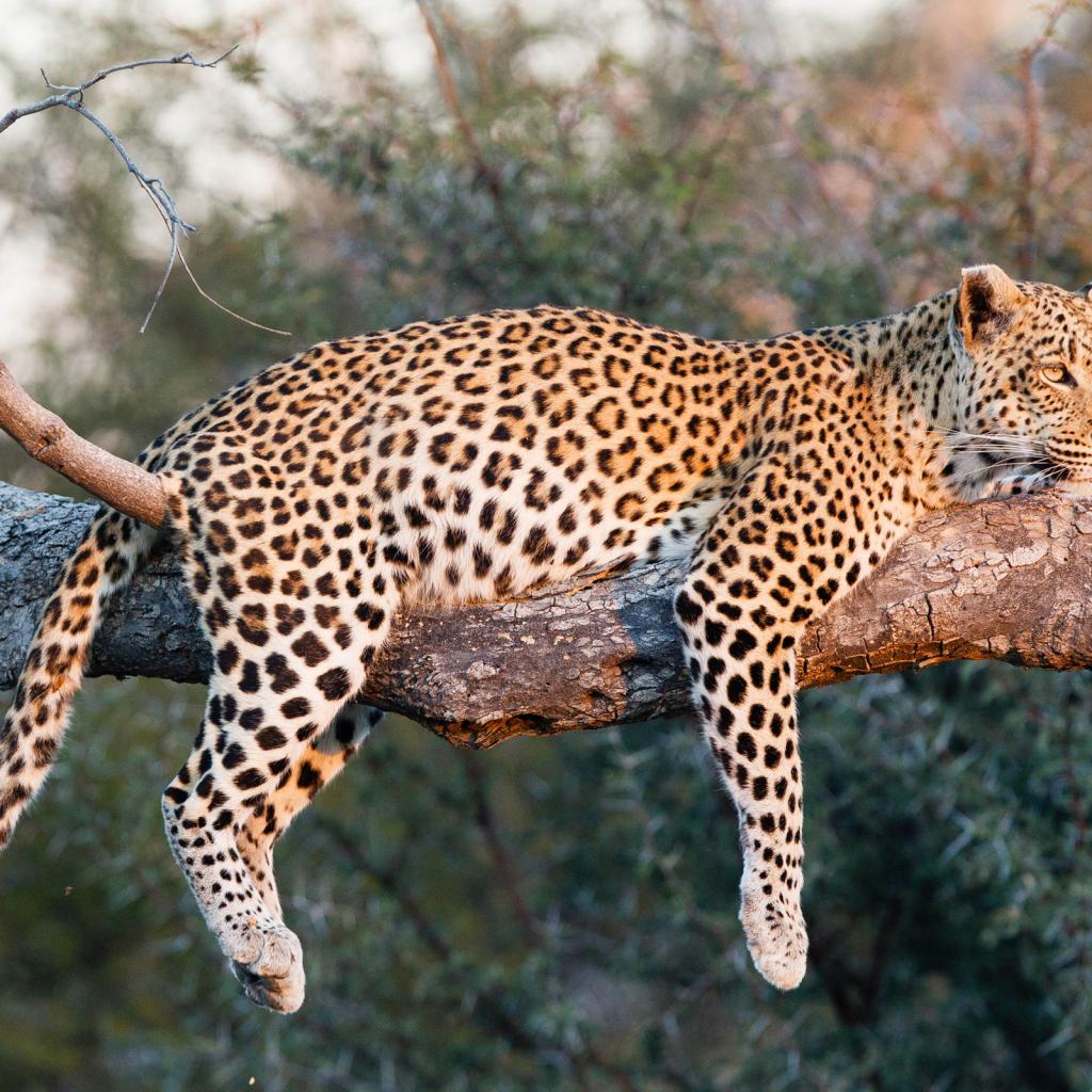 Обои Большой леопард в лучах солнца лежит на ветке