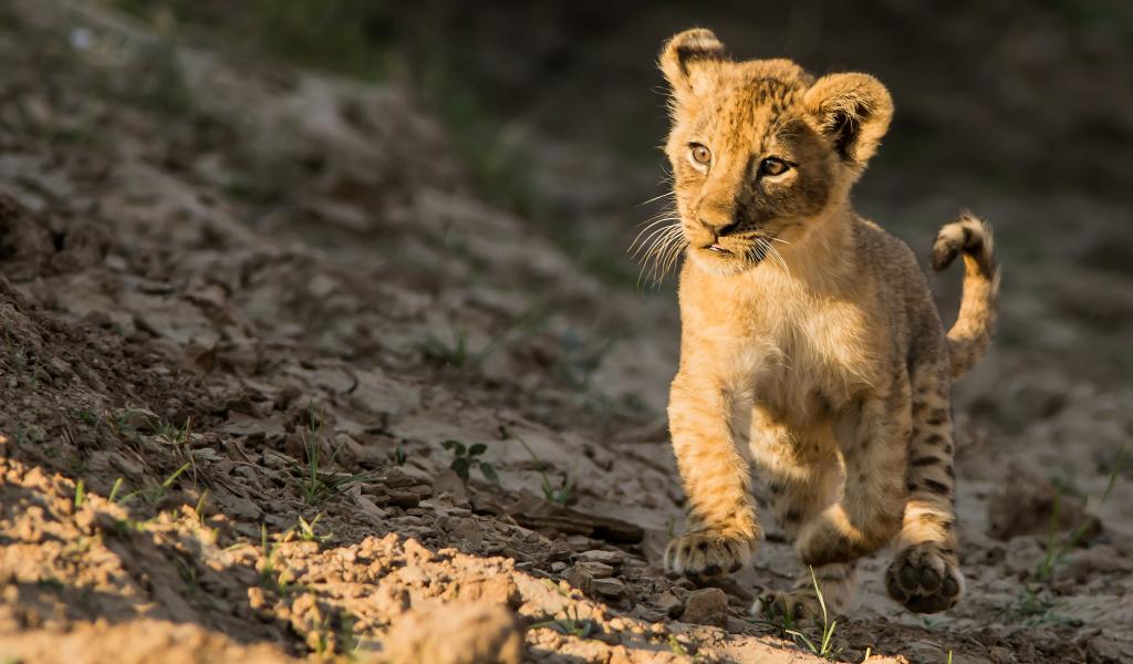 Обои Маленький львенок бежит по земле