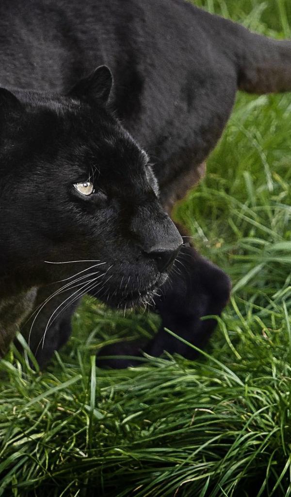 Обои Большая черная пантера идет по зеленой траве