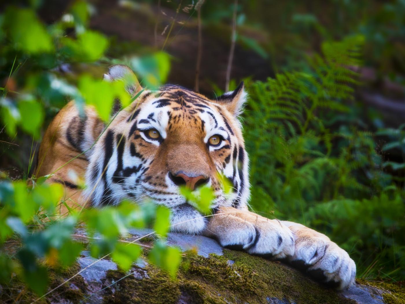 Обои Большой амурский тигр лежит на камне покрытым мхом