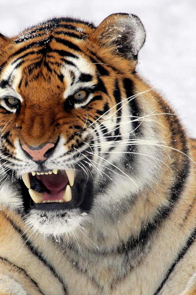 Обои Тигр с грозным оскалом лежит на снегу