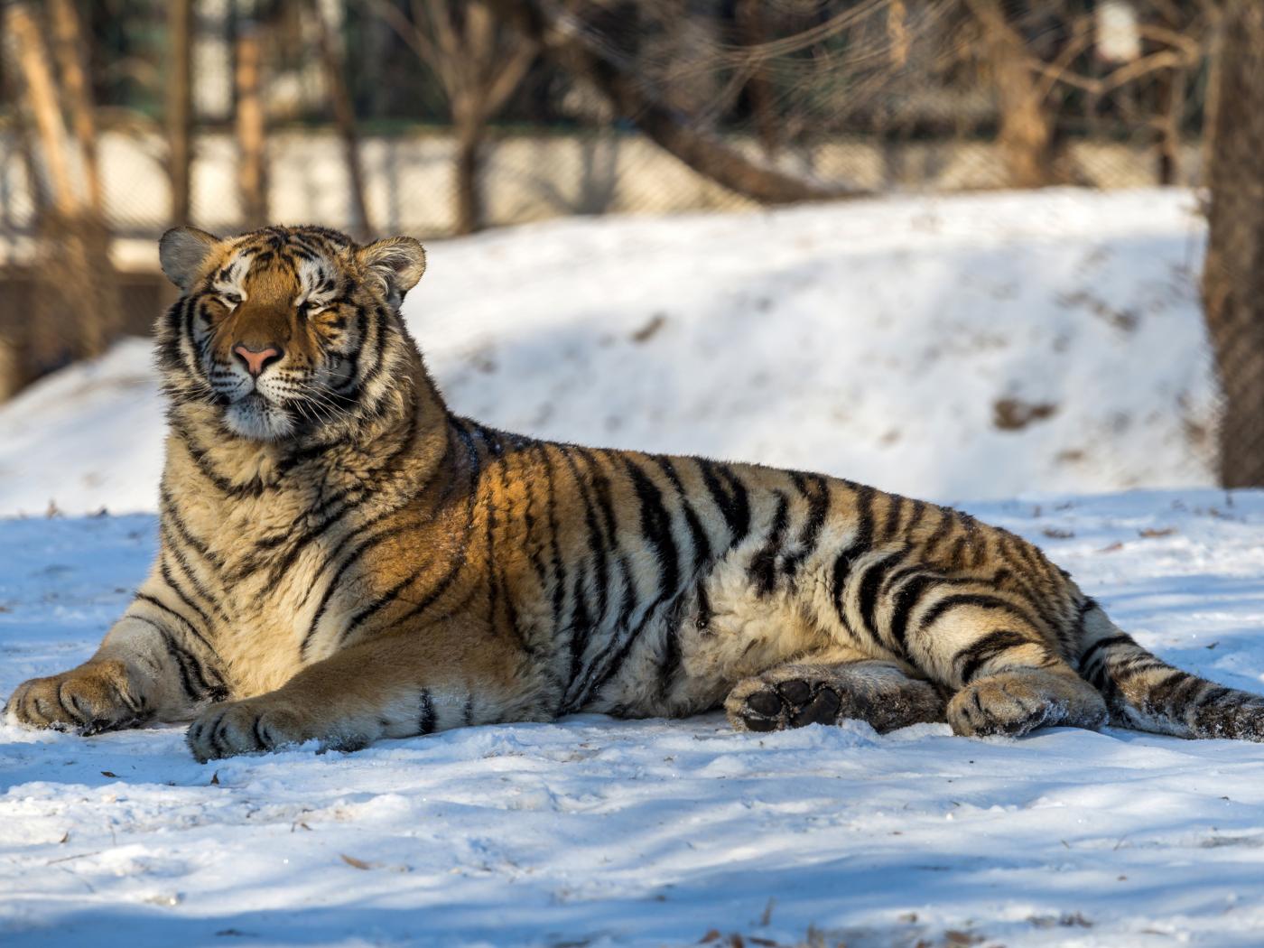 Обои Большой грациозный тигр лежит на снегу