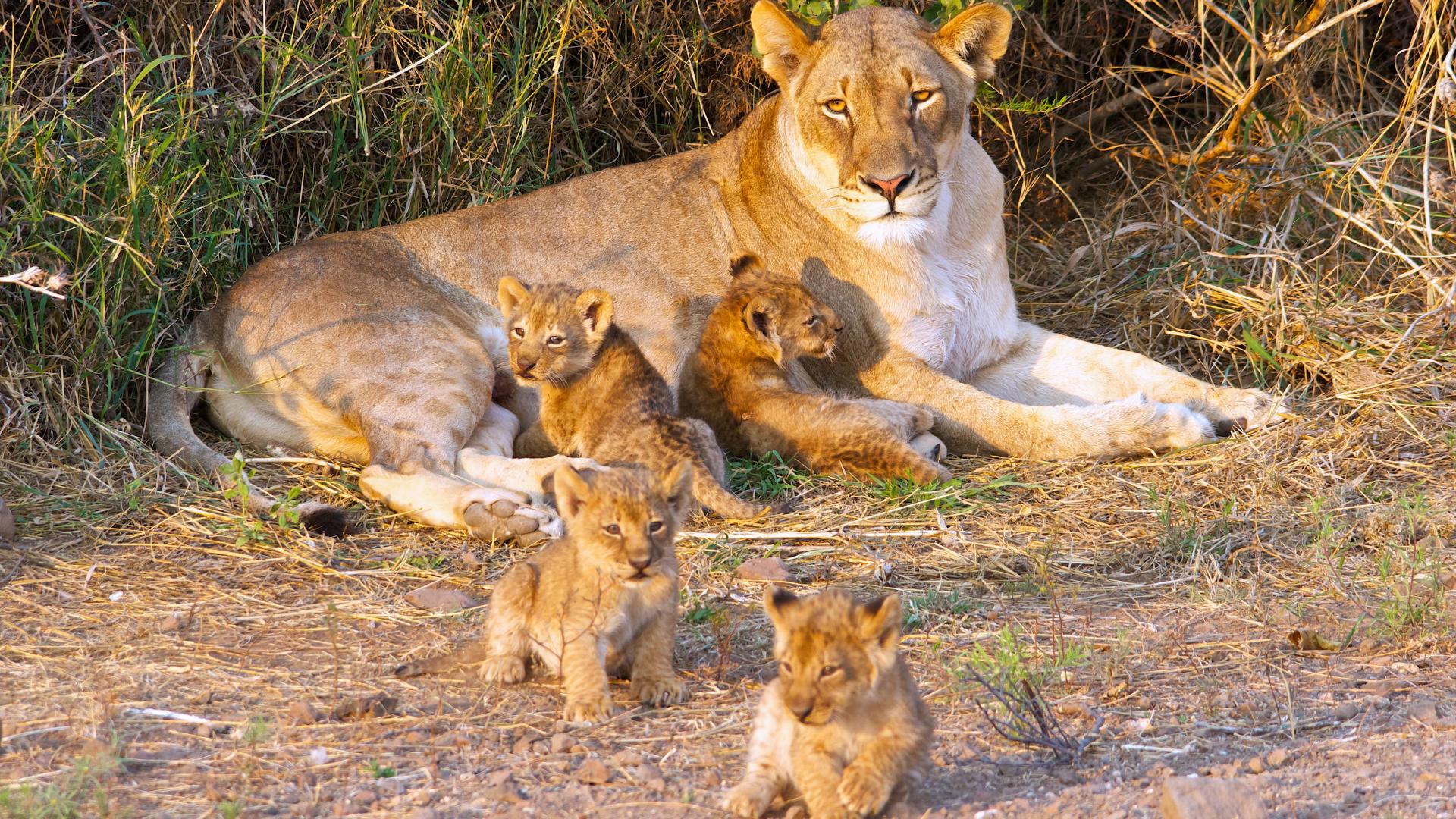 Обои Большая львица с маленькими забавными львятами