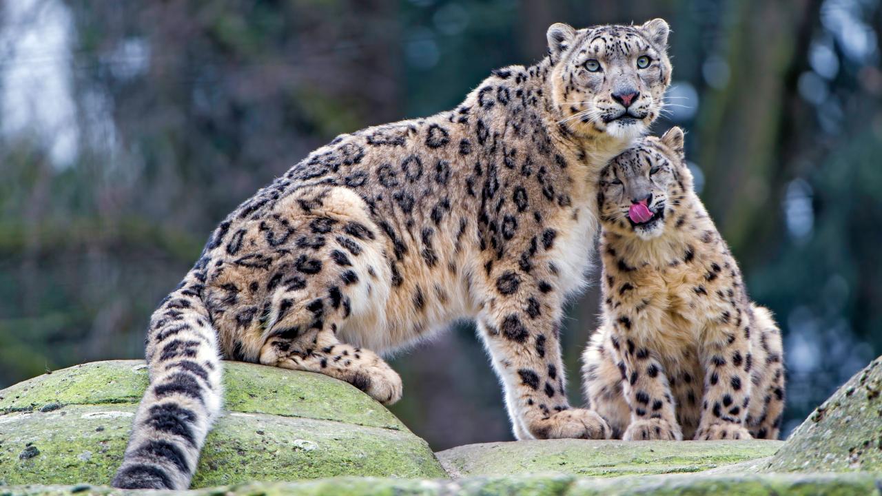 Обои Большой снежный барс с детенышем сидят на камне
