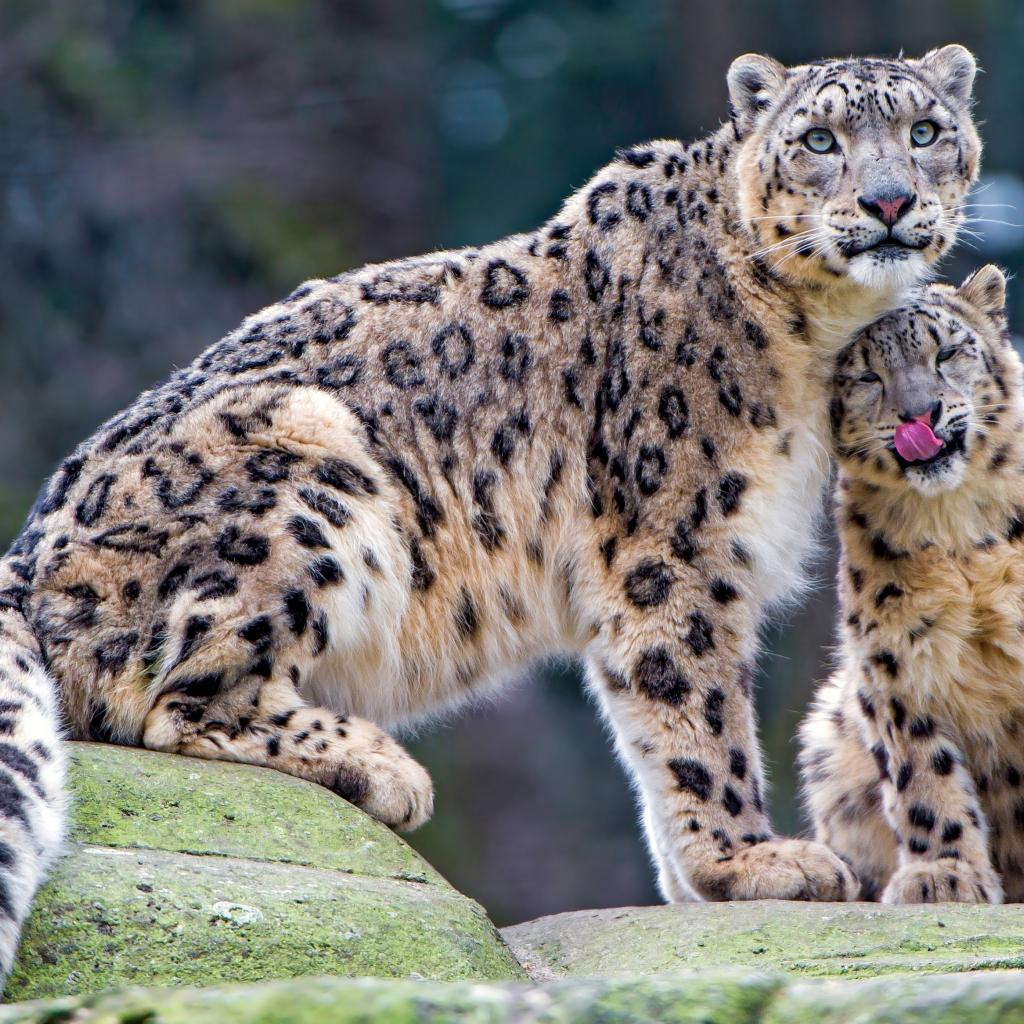 Обои Большой снежный барс с детенышем сидят на камне