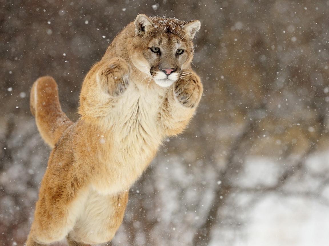 Обои Прыжок большой пумы зимой
