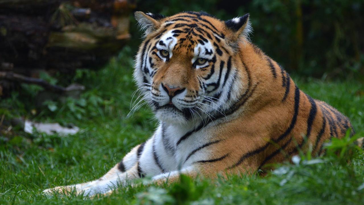 Обои Большой полосатый тигр лежит на зеленой траве