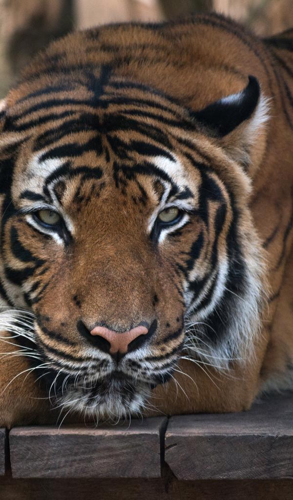 Обои Большой полосатый тигр лежит на деревянном полу