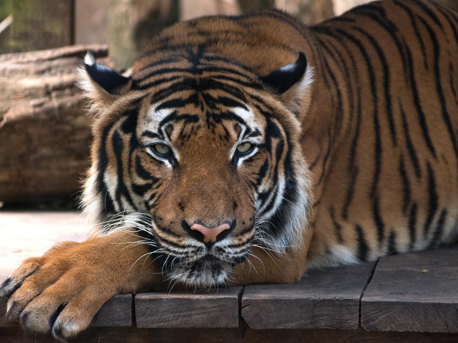 Обои Большой полосатый тигр лежит на деревянном полу