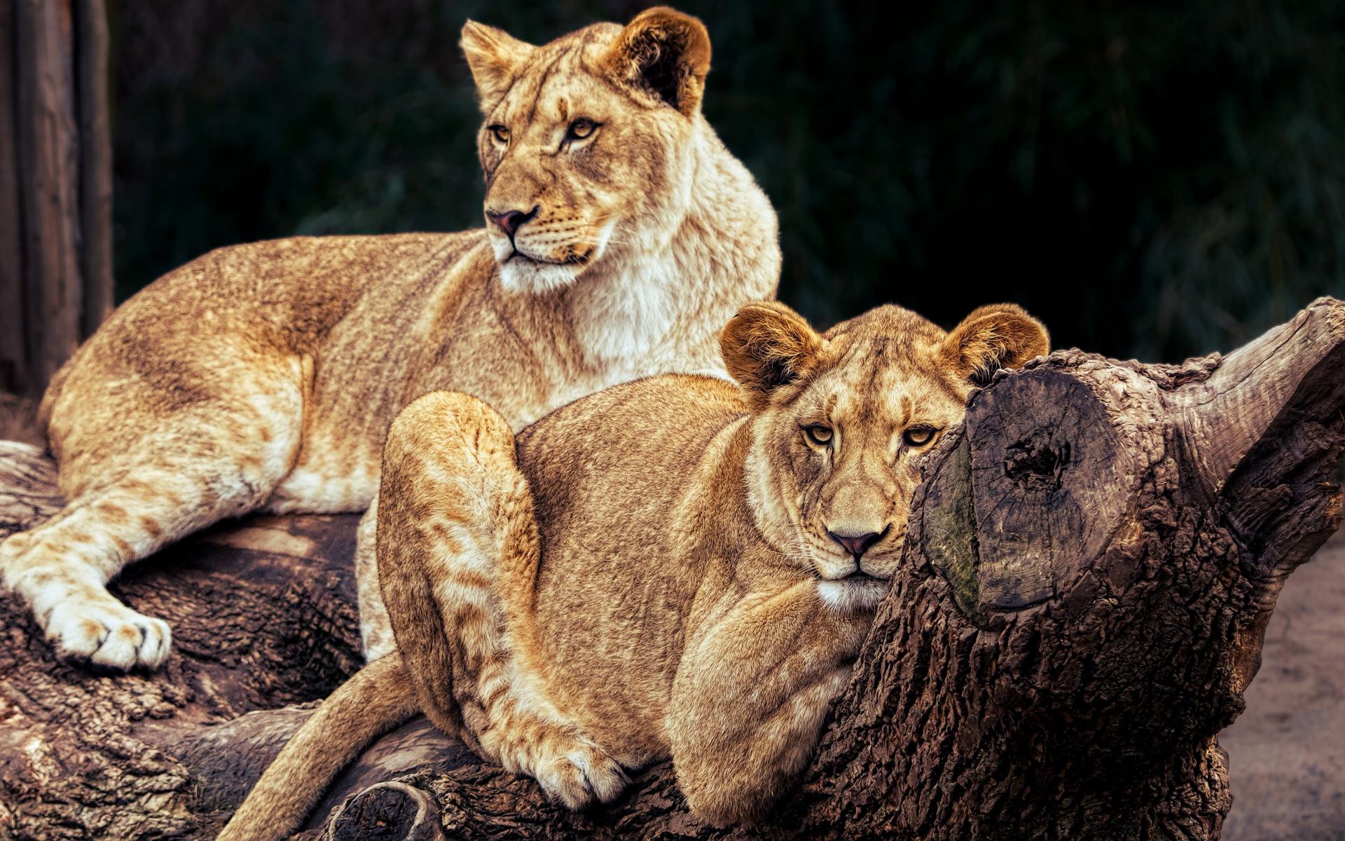 Обои Две большие львицы лежат на дереве