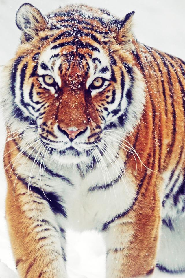 Обои Большой полосатый тигр идет по снегу зимой