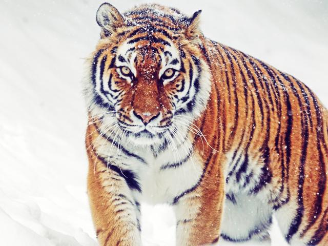 Обои Большой полосатый тигр идет по снегу зимой