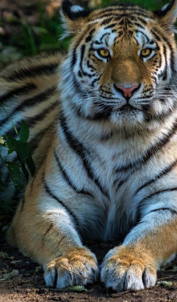 Обои Большой полосатый тигр лежит в зеленых зарослях