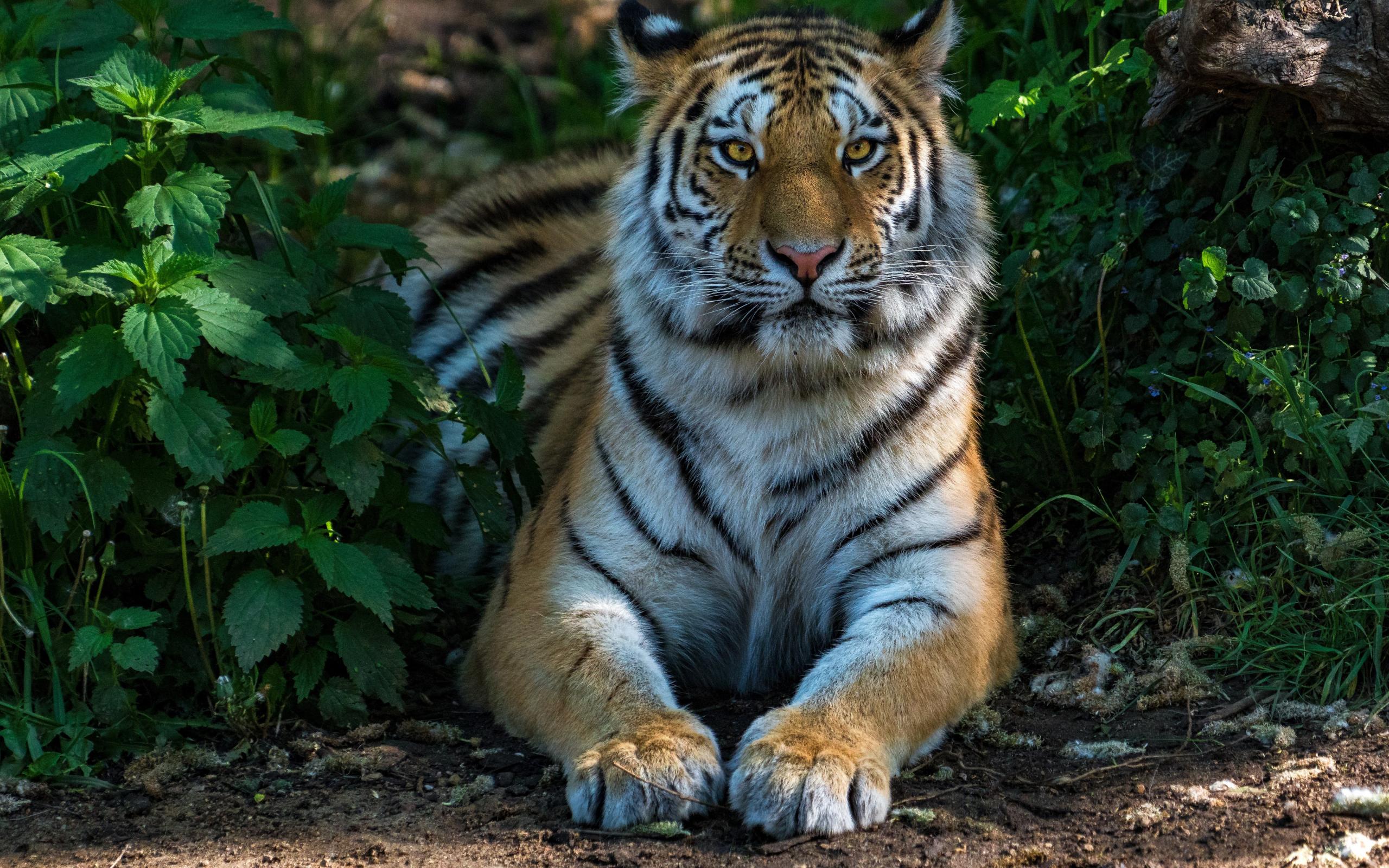 Обои Большой полосатый тигр лежит в зеленых зарослях