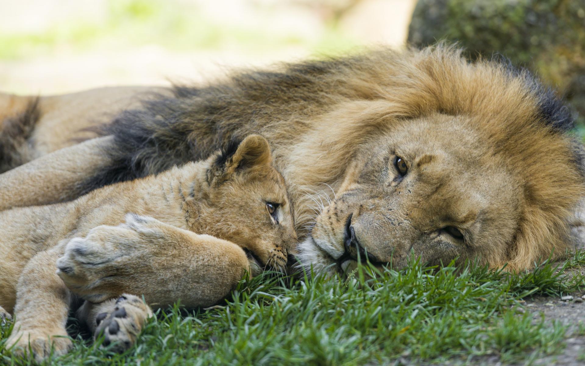 Обои Большой лев с маленьким львенком лежат на зеленой траве