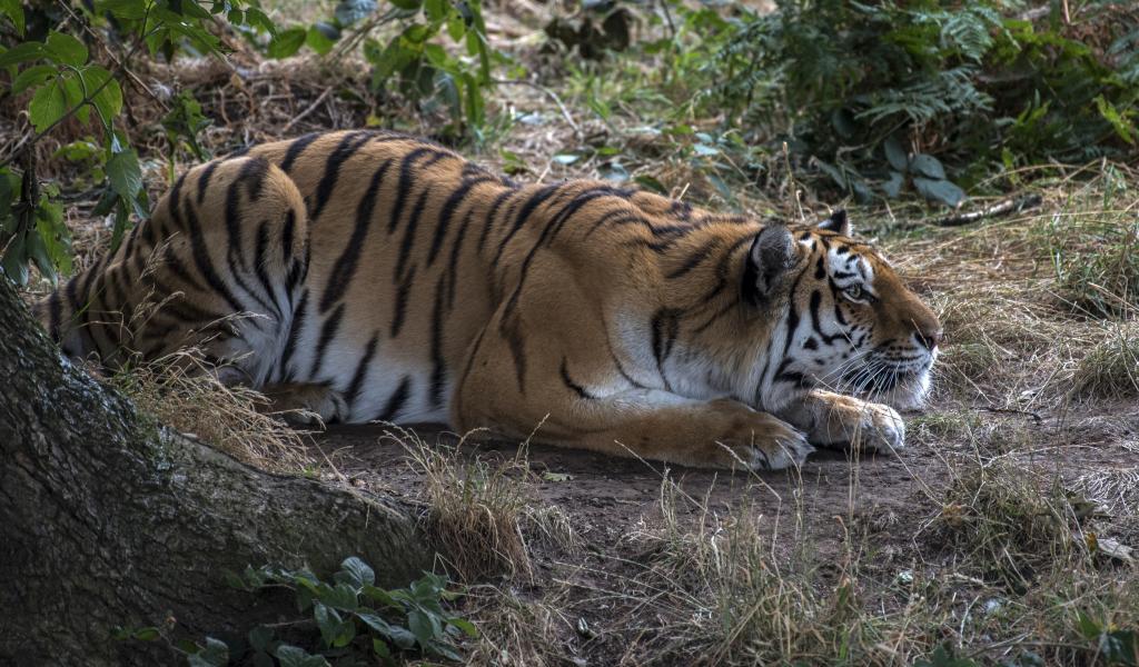 Обои Большой полосатый красивый тигр сидит в засаде